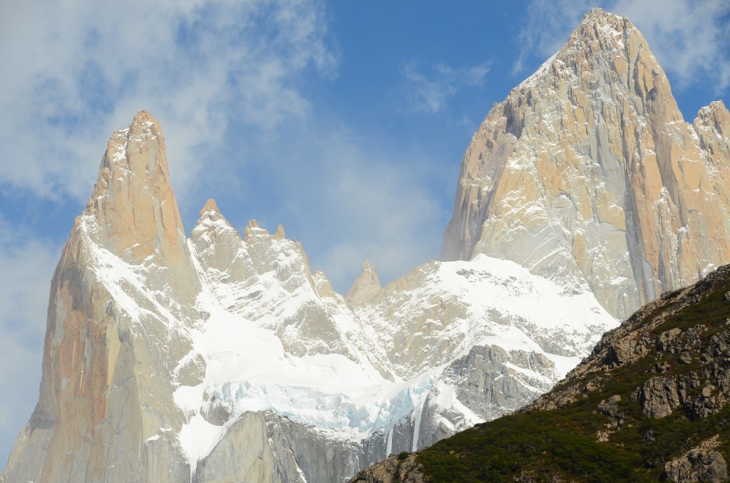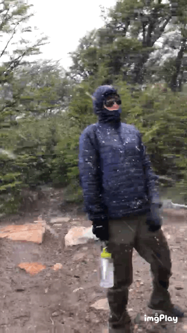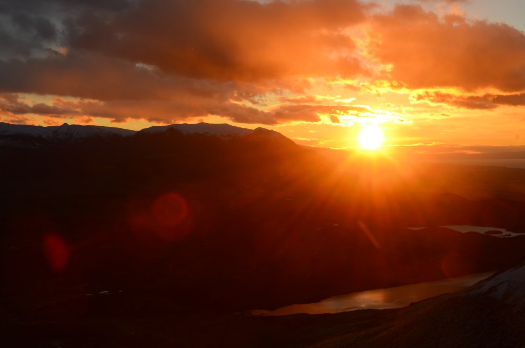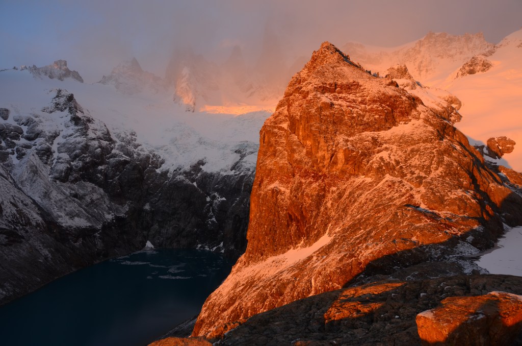 “Awakening” (never really slept) at 3:30am, we made our way up the Fitz Roy summit. The snow from the night before covered the trees and shrubs along the mountainside as well as the grizzled rocks that formed a makeshift staircase to the mountain ridge. It took just over an hour, with the first half hour being only visible with our headlamps, and the second visible through pinkish hues forming in the clouds over the valley. The summit was a sight to behold. Although we did not manage to get a completely cloud free view of the Fitz Roy itself, the sun rising and colouring the snow covered mountains pink and gold was worth the effort.