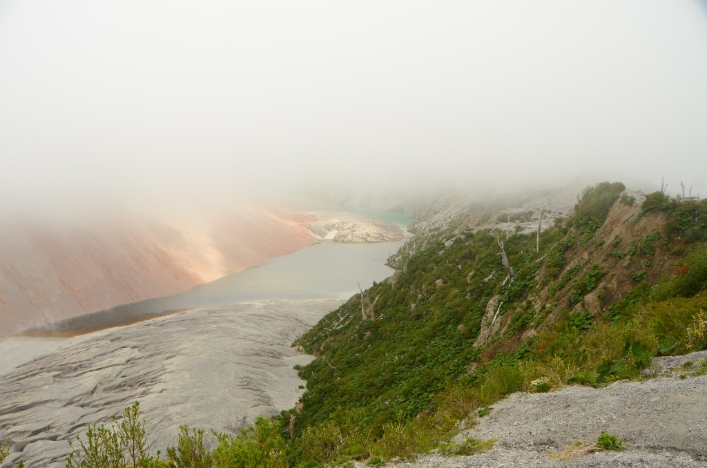 We took a literal dirt nap to see if the fog would clear, and it did partially. Couldn’t see the full cylinder cone, but could see the ash filled lake, and hear the steam coming from the mountain.