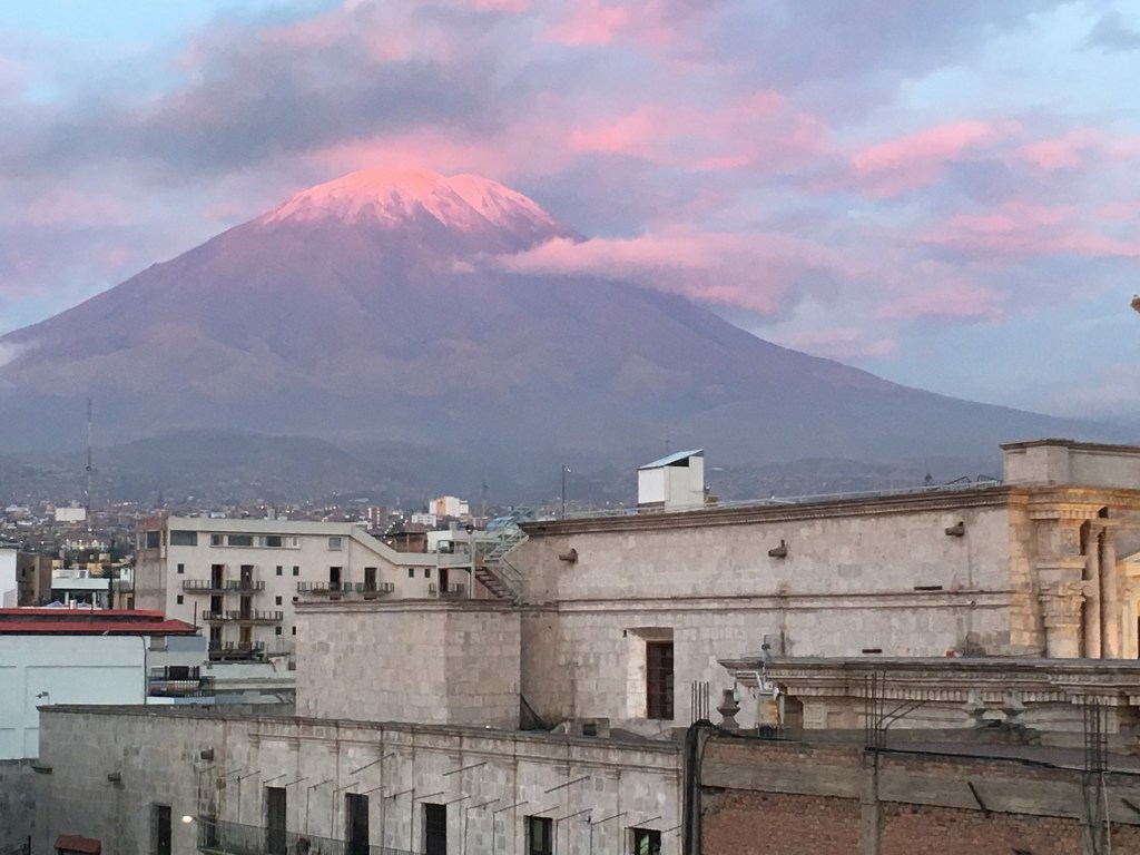 Arequipa is nestled in the ample bosom of three active volcanoes, each one typically shrouded in cloud.