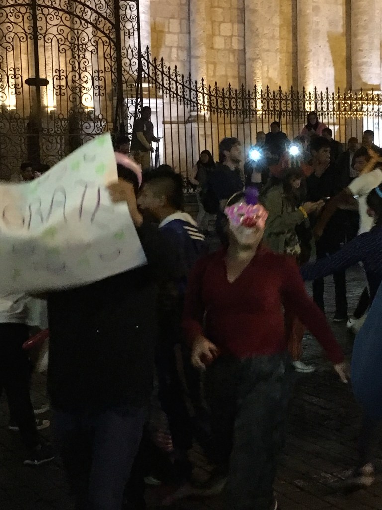 Arequipa is a great place. The main square is always extremely busy; day time concerts, carnival, peaceful protests, or night time mourners. Its a great place to just be in, with or without a plan. One night, that was exactly what we were doing. Suddenly drums start roaring and this squad of clowns come running into the square, with signs and balloons and a full band. They start a huge circle dance, and soon Luma is pulled into it. Not long after I am pulled into it. At the conclusion of this, a large amount of hugging ensues. There is about a 5 person hug, and me and Luma are side by side. At this point another clown hugs me from behind, surprising me and causing me to inhale sharply. The strangest thing happened in that moment, my sharp inhale sucked a sizable amount of Luma’s hair straight down my windpipe and tickled the inside of my lungs. There are some bad first date things to do; eating messy food, farting and talking too much politics. I had no idea that being caught with a fair amount of their hair dangling a foot down into your body cavity was even possible, but was sure it fit into the category of things not to do. The extraction process was….interesting. But it made for a good laugh.